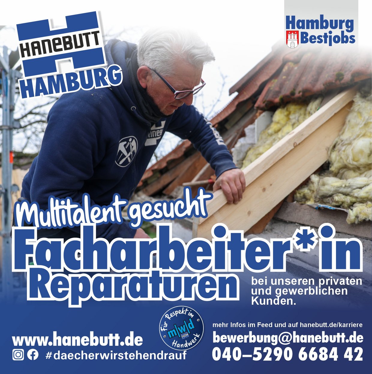 der seine Erfahrung bei uns einbringen will und auf unseren Baustellen alles gibt. Du wirst bei uns einen krisenfesten Job mit Perspektiven, leistungsgerechter, pünktlicher Bezahlung und einer Menge Extras erhalten. Das Unternehmen Hanebutt ist seit mehr als neun Jahrzehnten in ganz Norddeutschland sehr erfolgreich im Bauwesen tätig. Schwerpunkte Dachdeckerei, Zimmerei und Klempnerei. Am besten einfach anrufen oder eine Mail schreiben.